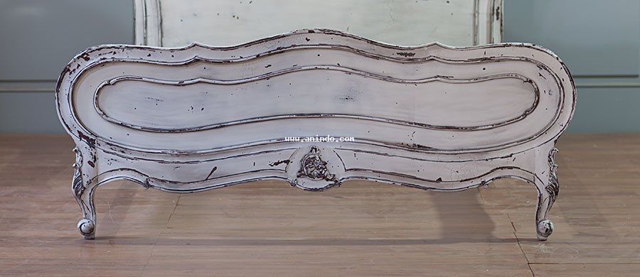 Aurora bed queen size is made of mahogany wood in vintage distressed white painted finish. Available in all bed sizes.