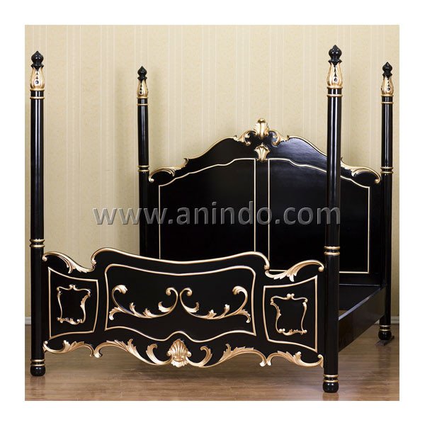 Four poster bed is made of mahogany wood in black combined with gold painted finish. It's king size bed. Available for all mattress size.