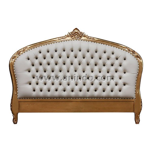 Nagita headboard is made of mahogany wood in gold leaf finish. Upholstered in white fake leather. It's queen size. Available for all mattress size.