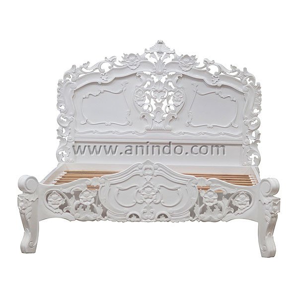 Rococo bed is made of mahogany wood in white painted finish. It's king size. Available for all mattress size.