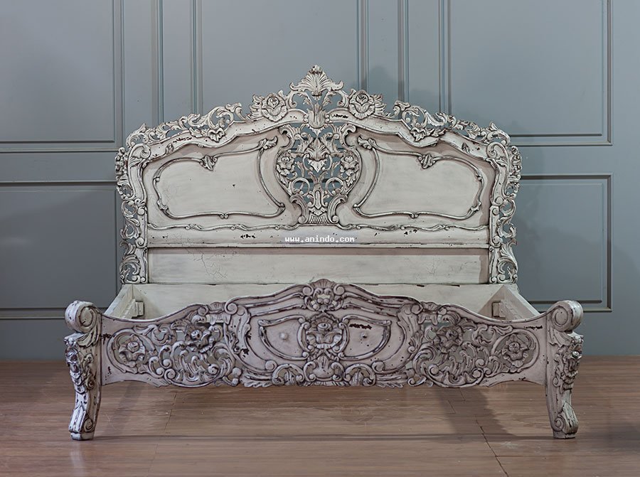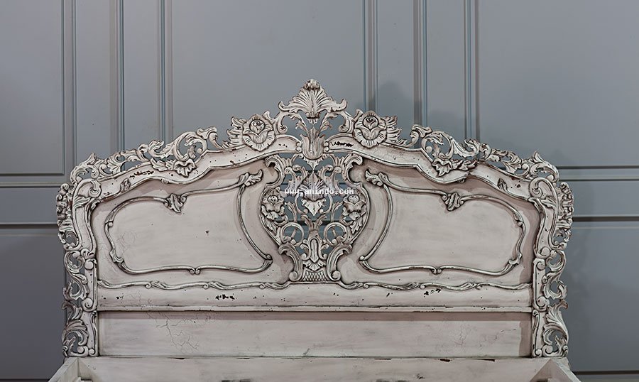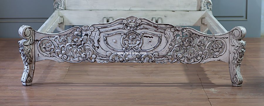Rococo bed king size is made of mahogany wood in vintage distressed white painted finish. Available in all mattress size.