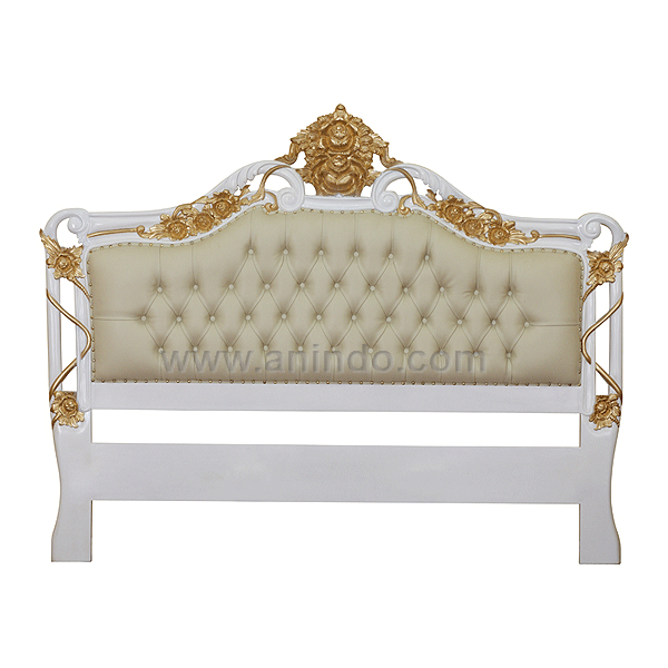 Top flower carved headboard is made of mahogany wood in white combined with gold painted finish. Upholstered in cream faux leather. It's full size headboard. Available for all mattress size.