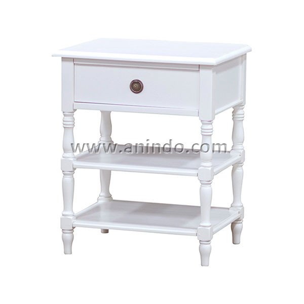 Alabama bedside table 1 drawer 2 shelves is made of mahogany wood in white painted finish. Antique solid brass handle.