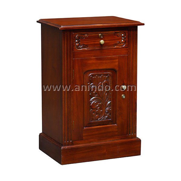 Amor bedside cabinet 1 door 1 drawer is made of solid mahogany wood in red mahogany finish. Antique solid brass handles.