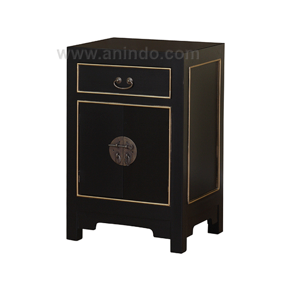 Chinese bedside cabinet 2 doors 1 drawer is made of solid mahogany wood in black combined with gold painted finish. Antique solid brass handles.