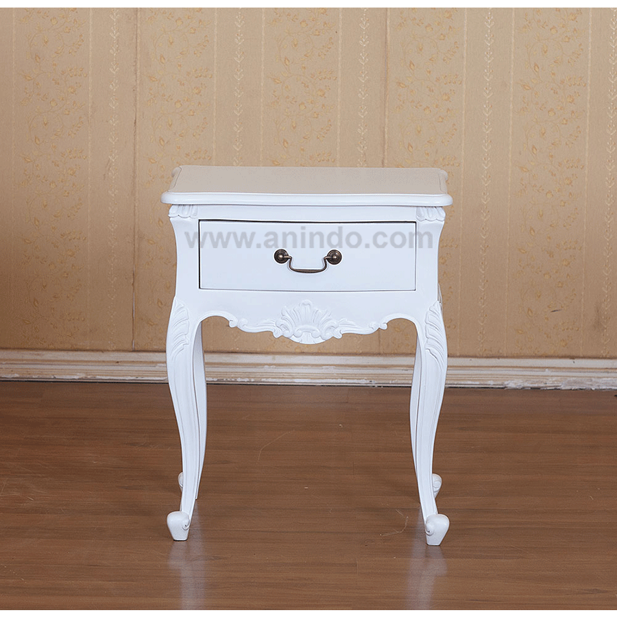 Timo bedside table 1 drawer carving is made of mahogany wood in white painted finish. Antique solid brass handle.