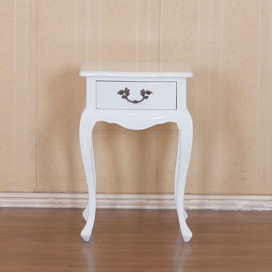 Torino bedside 1 drawer is made of solid mahogany wood in white glossy finish. Antique solid brass handle.
