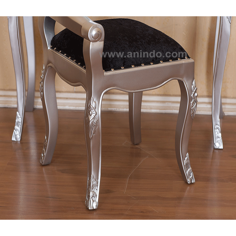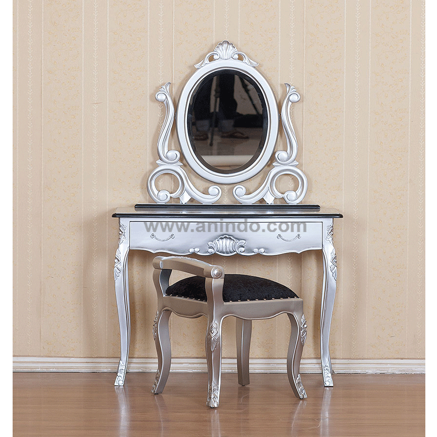 Skinny dressing table with mirror & stool is made of mahogany wood in silver painted finish. Black marble top. Silver handles.
