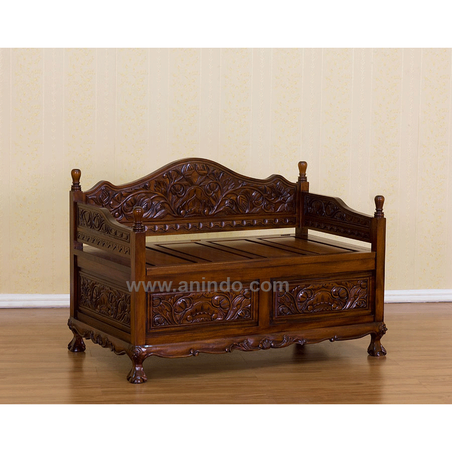Carved bench claw legs is made of solid mahogany wood in pecan finish.