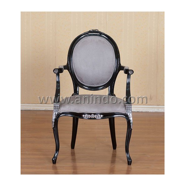 Our celine arm chair is made of mahogany wood in black painted combined with antique silver finish. Upholstered in light grey fabric.