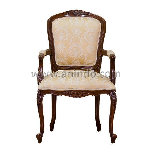 Our classic dining chair carver is made of?mahogany wood in walnut finish. Upholstered in gold floral fabric.
