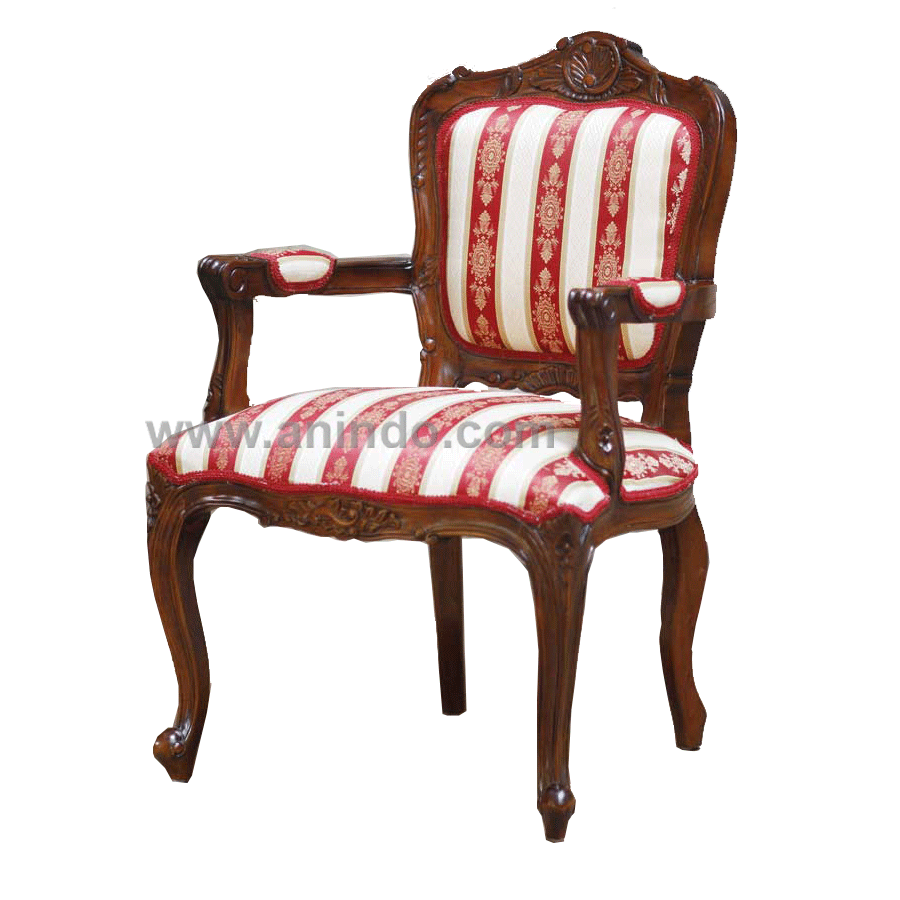 French arm chair is made of solid mahogany wood in walnut finish. Upholstered in red stripes fabric.