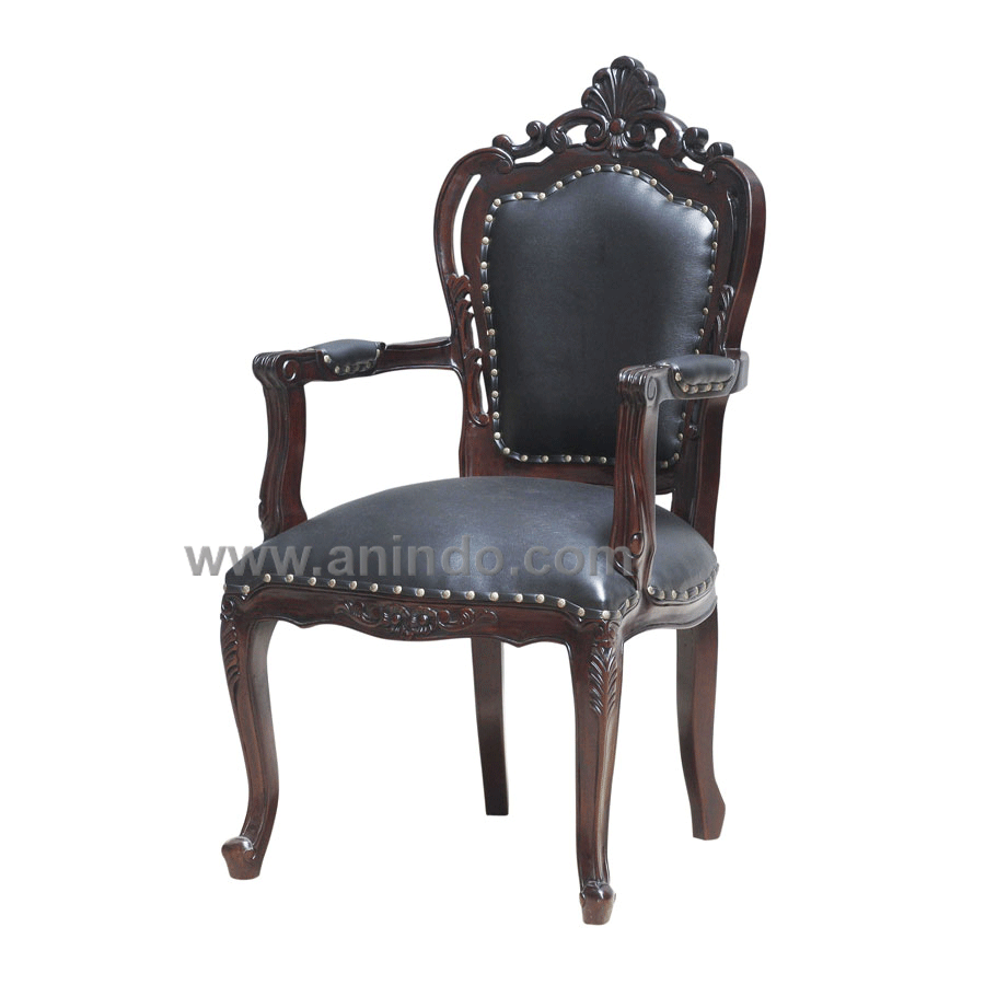 French carved chair arm is made of solid mahogany wood in dark mahogany finish. Upholstered in black faux leather.