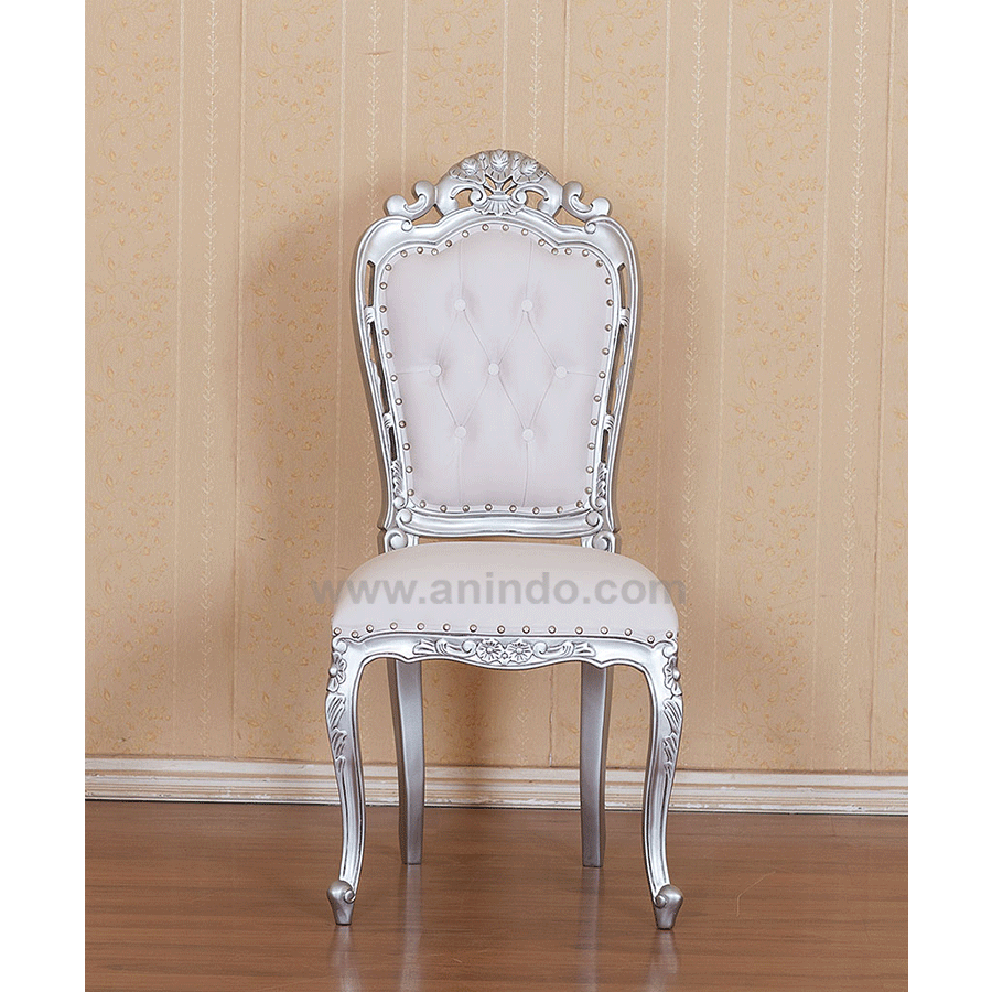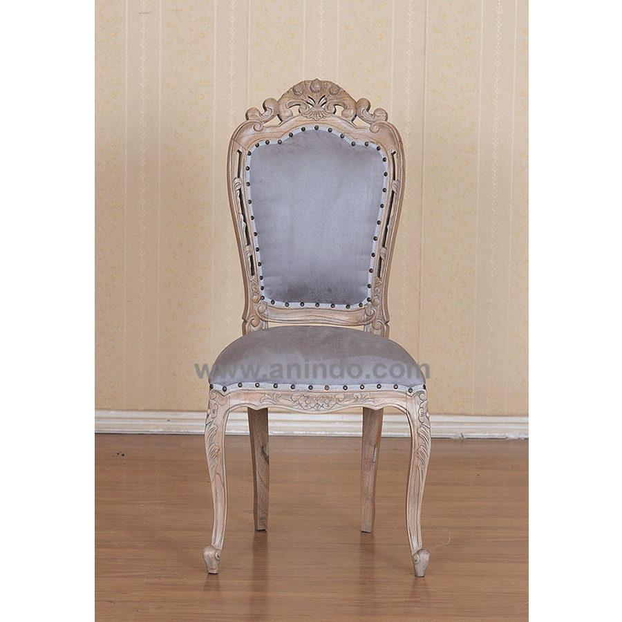 Our french carved chair diner is made of?mahogany wood in silver painted finish. Upholstered in pink suede fabric.
