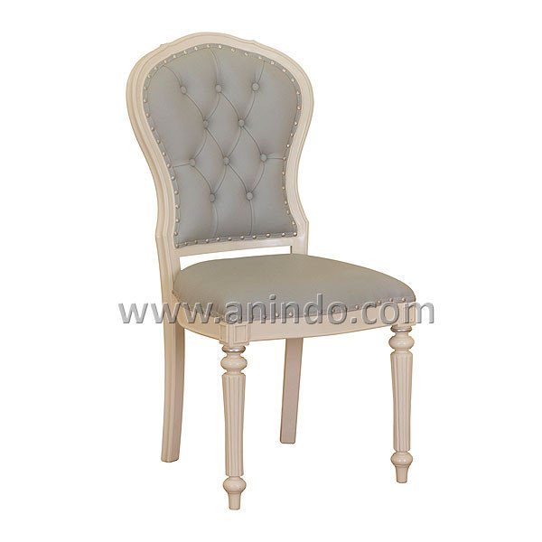 Kelana dining chair is made of mahogany wood in cream painted finish. Upholstered in grey faux leather.