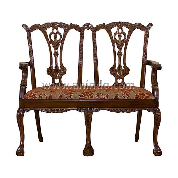 Our chippendale chair 2 seater is made of solid mahogany wood in walnut finish. Upholstered in red floral fabric.