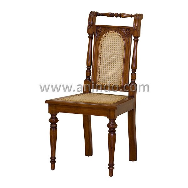 Simple rattan chair is made of solid mahogany wood in pecan finish.