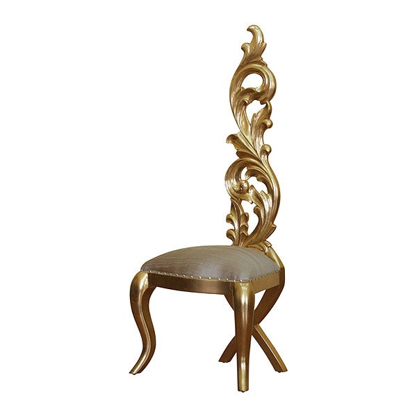 Our tall back chair?is made of?mahogany wood in gold leaf finish. Upholstered in grey silk fabric.