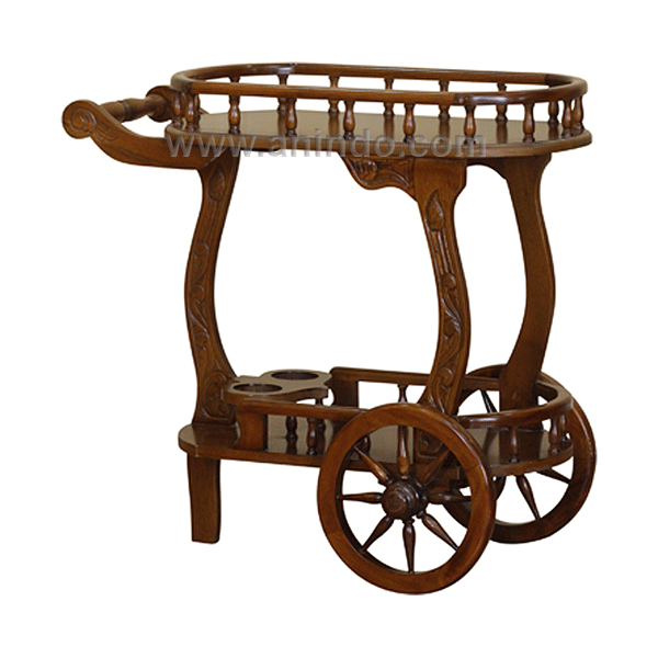 Becak tea cart is made of solid mahogany wood in pecan finish.