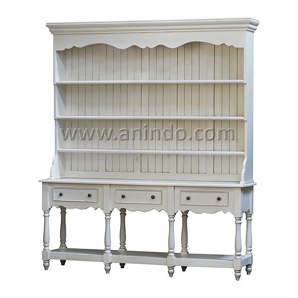 Kitchen cabinet 3 drawers with shlves is made of solid mahogany wood in cream painted finish. Antique solid brass handles.