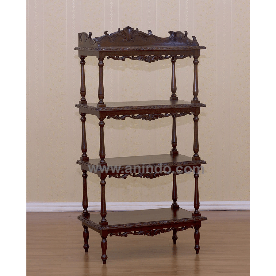 Catherine rack carving 4 shelves is made of solid mahogany wood in walnut finish.