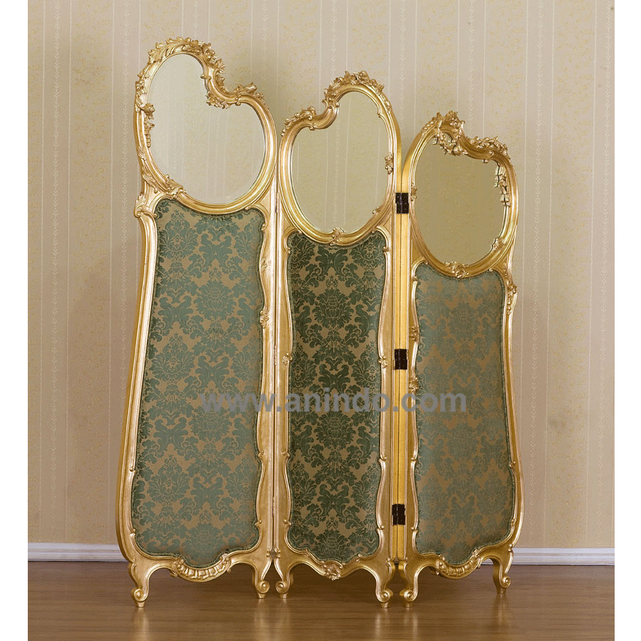 Our room divider is made of solid mahogany wood in gold leaf finish. Upholstered in green floral fabric.