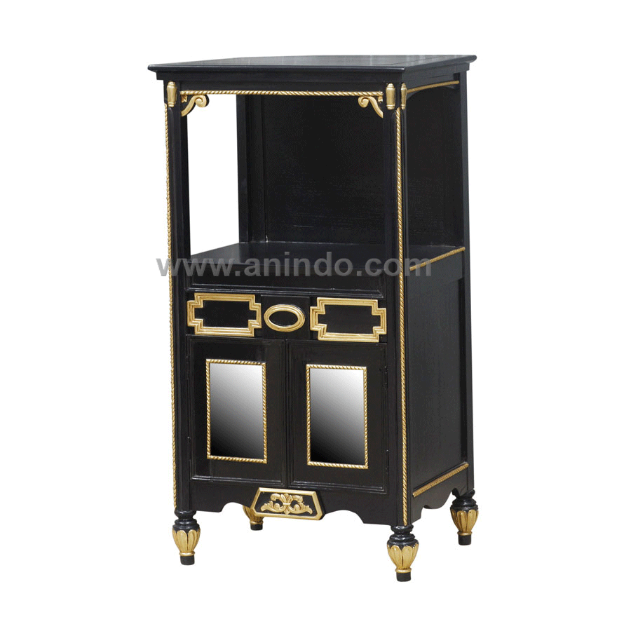 Small rack cabinet is made of solid mahogany wood in black combined with gold painted finish.