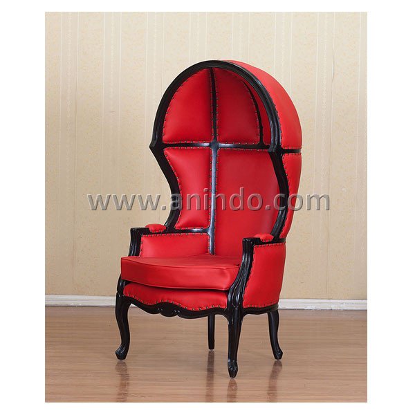 Canopy chair is made of solid mahogany wood in black painted finish. Upholstered in red fake leather.
