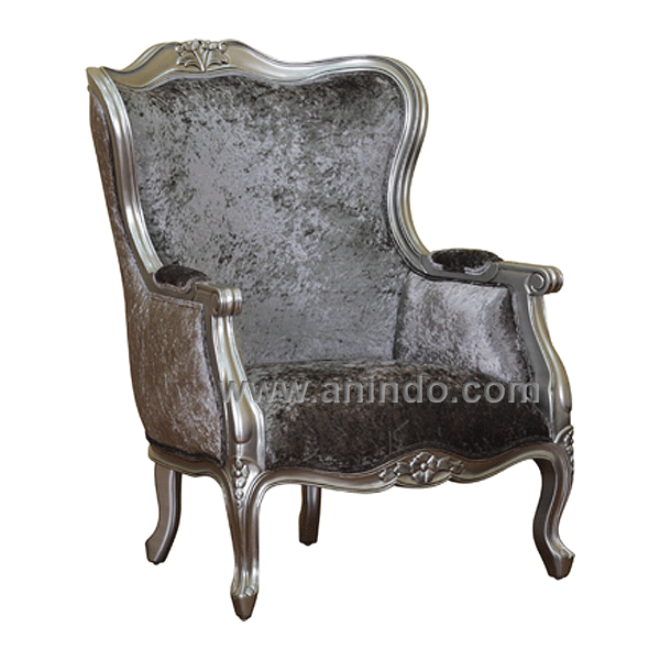 Our french carved wing chair?is made of solid mahogany wood in silver leaf finish. Upholstered in silver floral fabric.