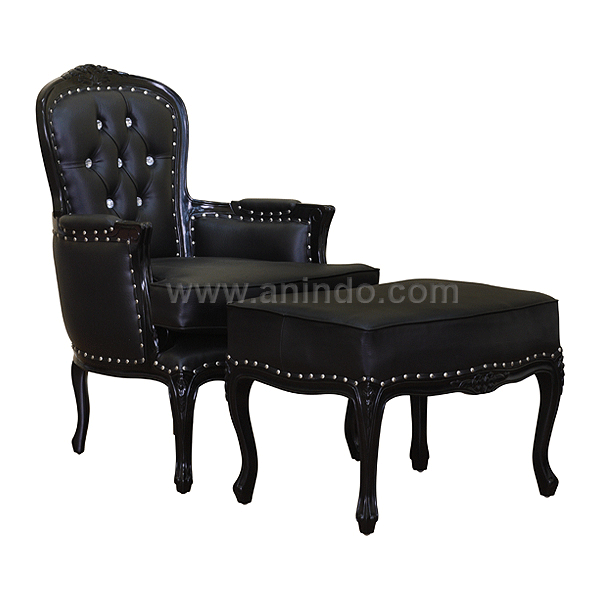 Our lounge carved chair with stool?is made of solid mahogany wood in?black painted finish. Upholstered in black fake leather.
