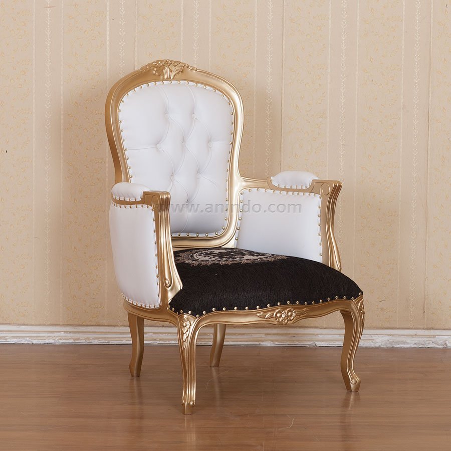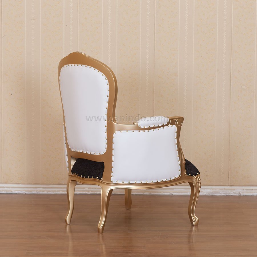 Louis arm chair gold is made of solid mahogany wood in gold painted finish. Upholstered in white fake leather & motiff fabric.