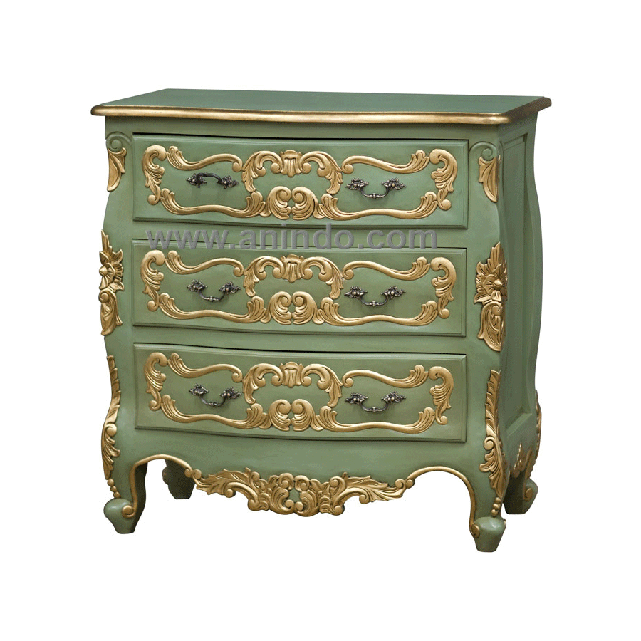 3 drawers carved commode is made of mahogany wood in green combined with gold painted finish.