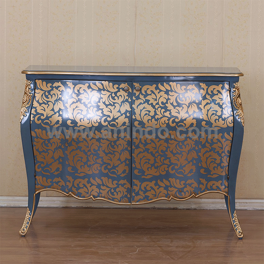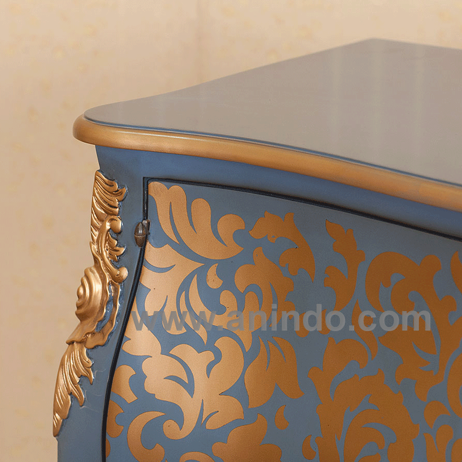 Commode 2 doors is made of mahogany wood in blue combined with floral gold painted finish.