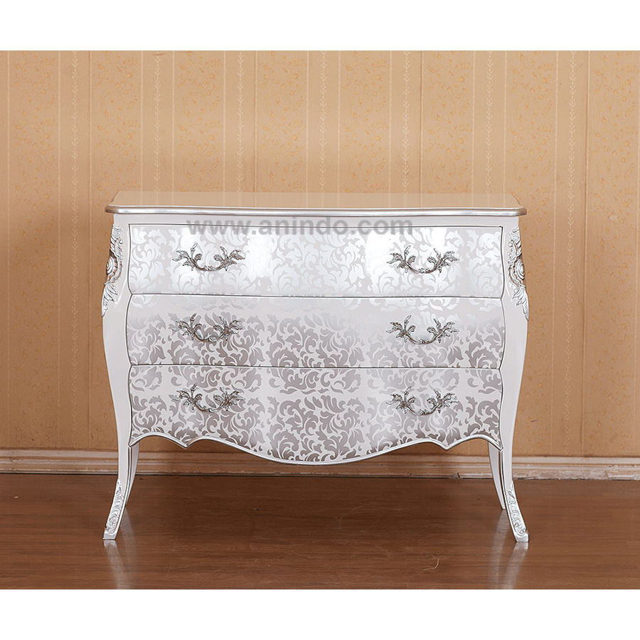 Our?3 drawers?commode is made of sustainable mango wood in white combined with?silver floral?painted finish.