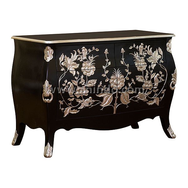 Our heavy carved commode is made of?mahogany wood in black combined with silver painted finish.