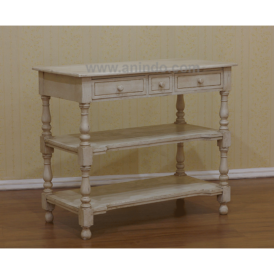 Our 3 drawers console with self is made of mahogany wood in antique cream painted finish.