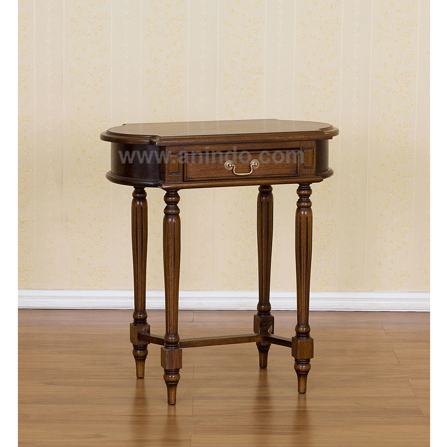 Our oval?console table is made of mahogany wood in walnut finish.