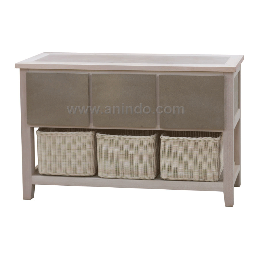 Junior console with rattan basket is made of solid mindi wood in natural mindi finish.