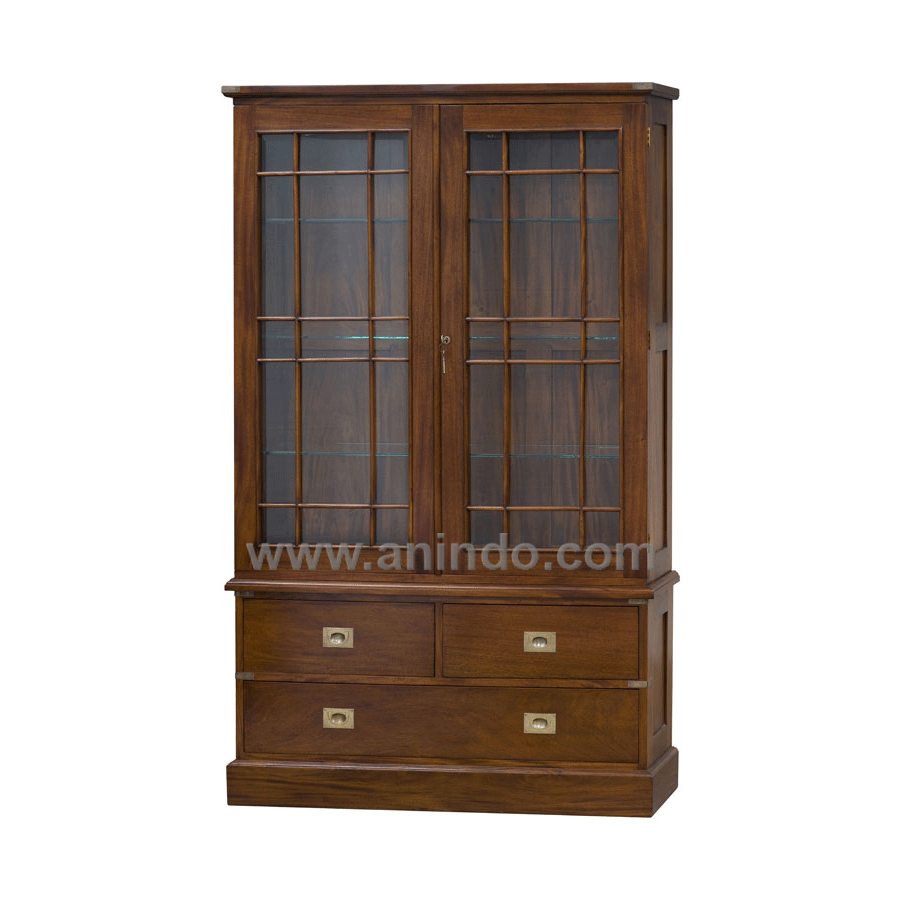 Display cabinet 3 drawers is made of solid mahogany wood in pecan finish.