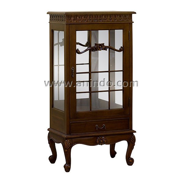 Our glass display cabinet 1 door 1 drawer carving is made of solid mahogany wood in walnut finish.