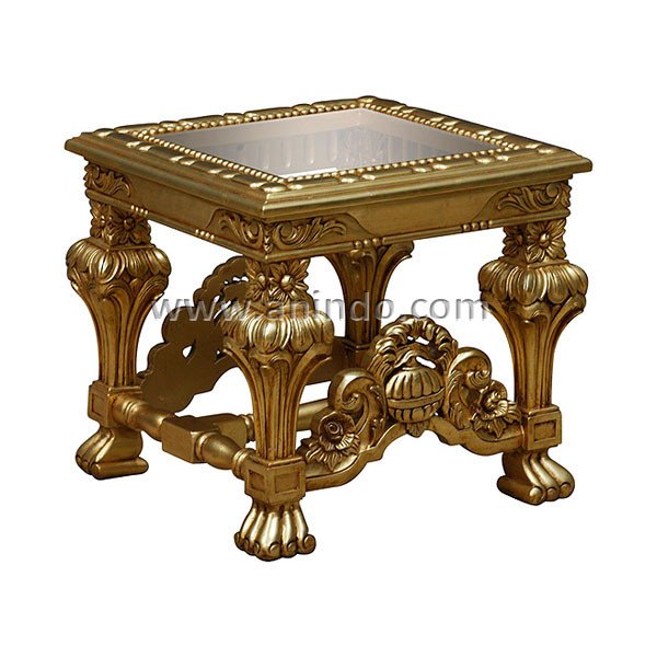Our carved end table is made of mahogany wood in gold leaf finish with glass top.