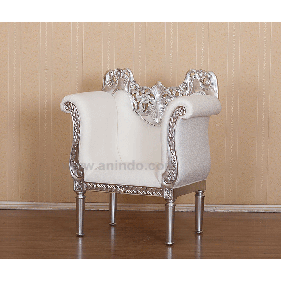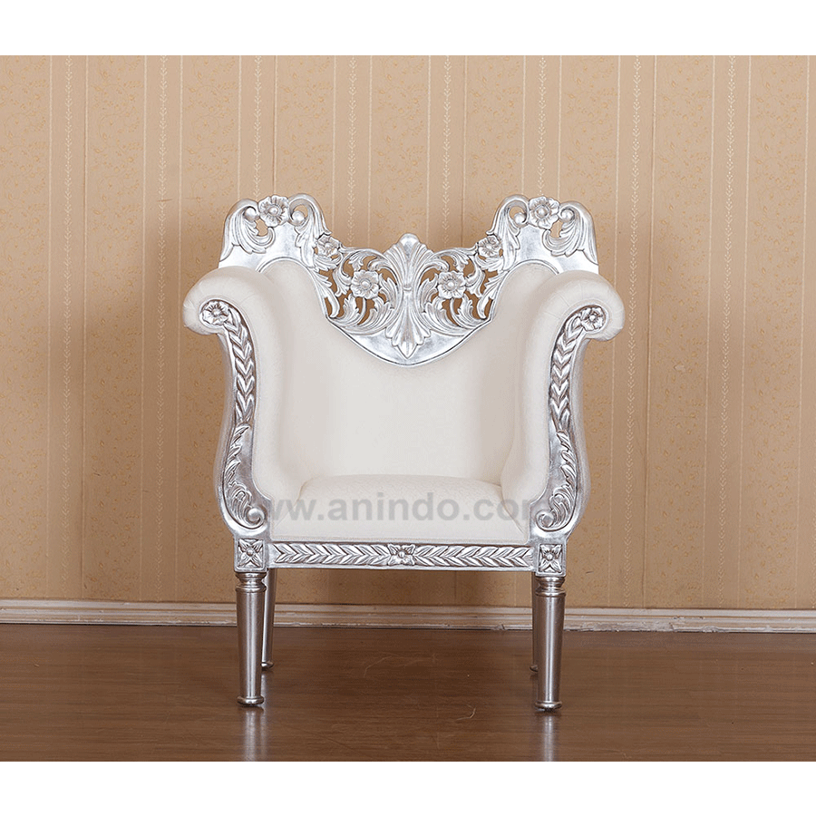 Arti sofa 1 seater is made of solid mahogany wood in silver leaf finish. Upholstered in white floral fabric.