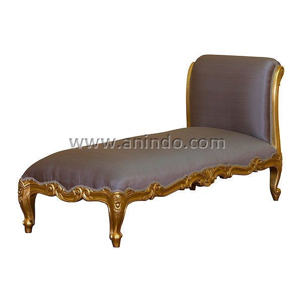 Our french chaise is made of mahogany wood in gold leaf finish. Covered in silk fabric.