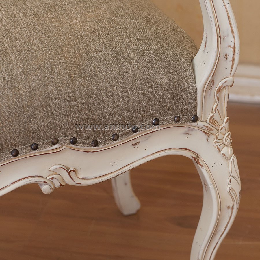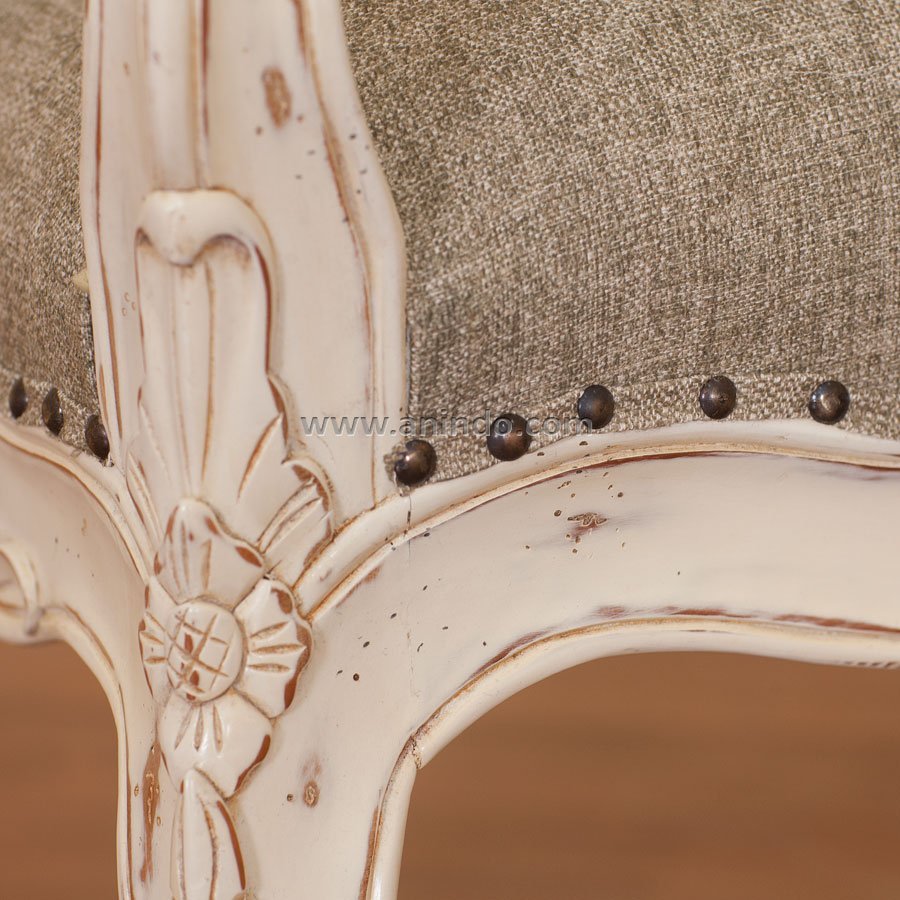 Alexandria carved stool is made of solid mahogany wood in distressed white heritage painted finish. Upholstered in dark natural linen fabric.
