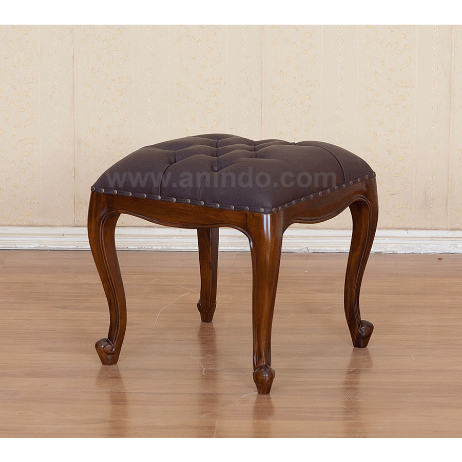 Clara stool is made of solid mahogany wood in walnut finish. Upholstered in brown fake leather.