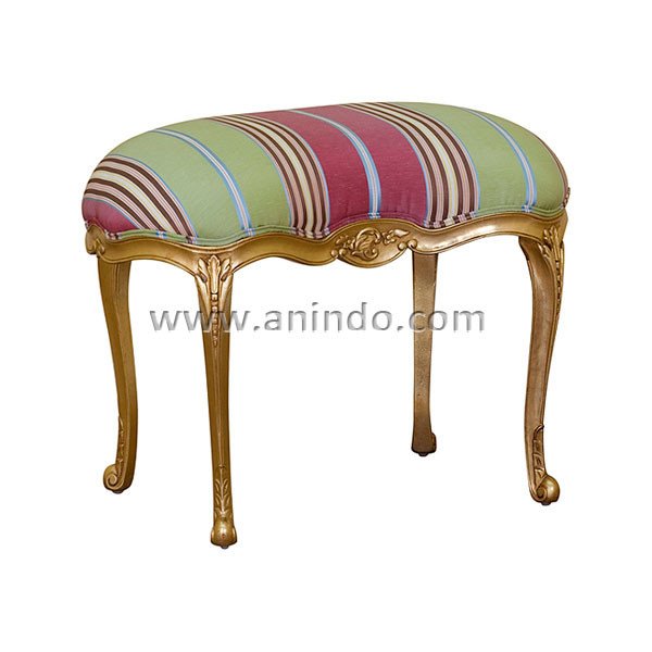 French stool is made of solid mahogany wood in gold leaf finish. Upholstered in stripes fabric.