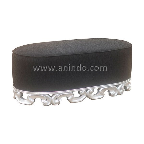 Oval carved stool is made of solid mahogany wood in silver leaf finish. Upholstered in black tapestry fabric.