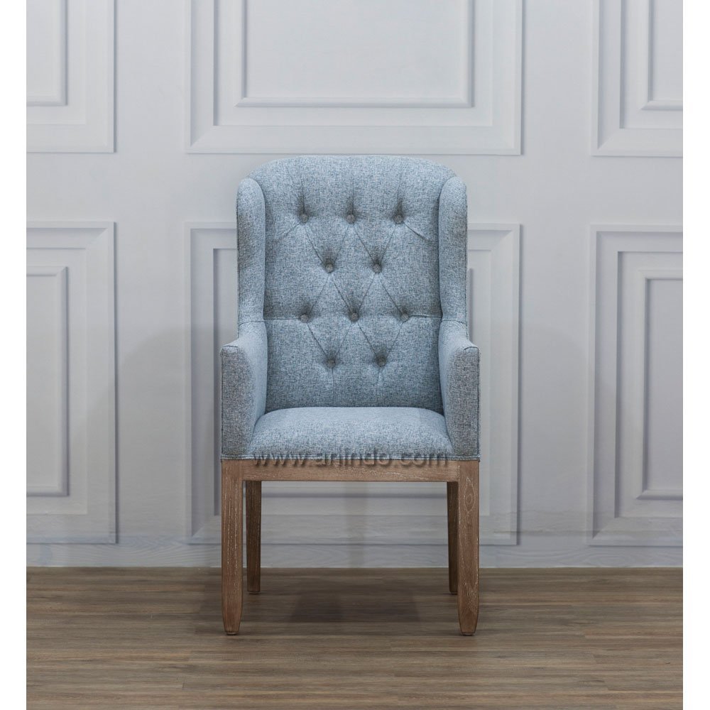Boston arm chair is made of solid mindi wood. Antique finish. Upholstered in light grey fabric.