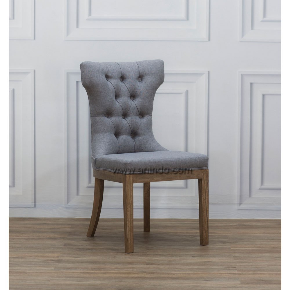 Edison dining chair is made of solid mindi wood. Antique finish. Upholstered in grey fabric. Match to Edison Dining Table