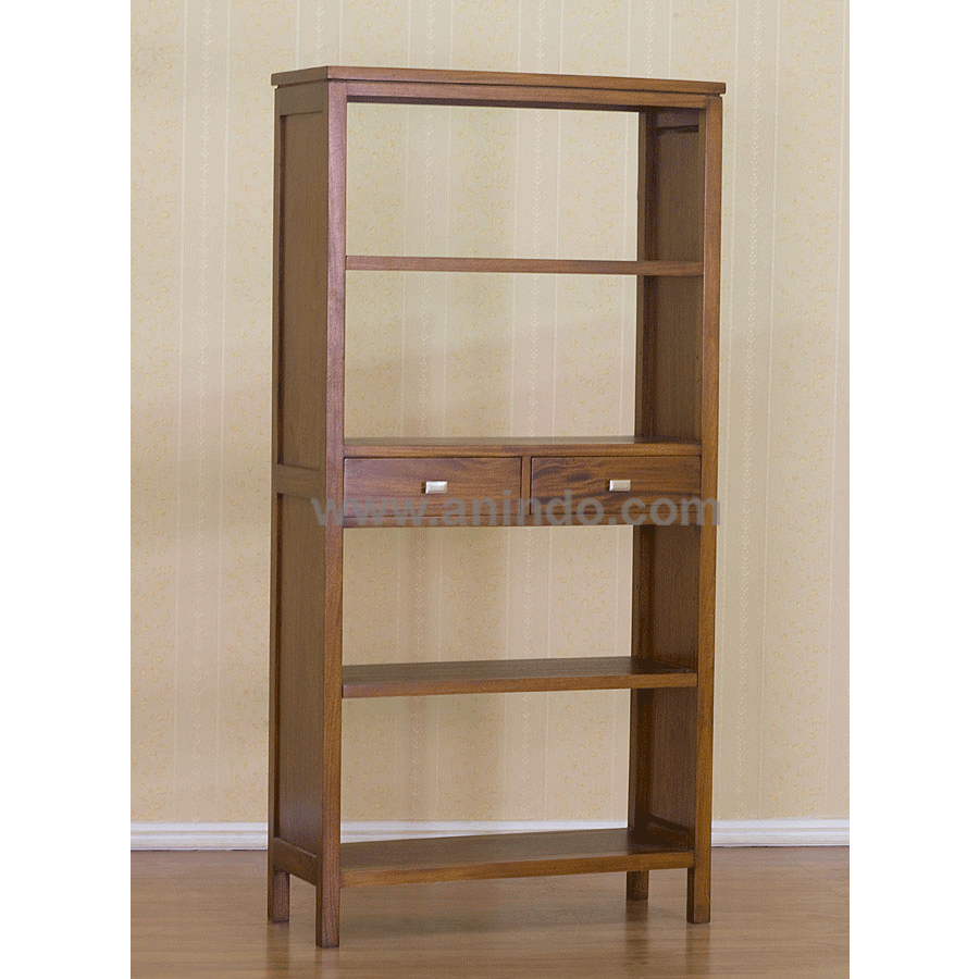 Our open bookcase 2 drawers is made of mahogany wood in pecan finish.